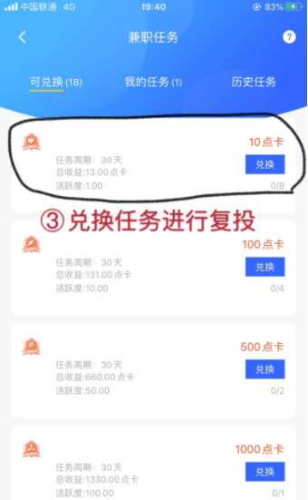 3、如果点卡够了,进入众赢兼职app“我的”-“我的任务”去兑换任务进行复投,当然,你也可以把点卡卖掉,换现金。这都是后面的事了,看到时众赢兼职的具体发展情况而定。