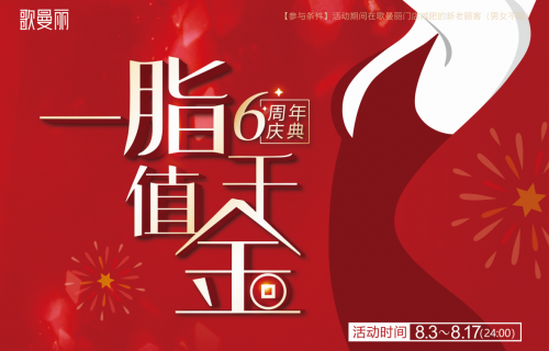 喜逢歌曼丽六周年庆典,为回馈歌粉们的一路陪伴与支持,歌曼丽斥资千万筹备“一「脂」值千金”大型活动,正装护肤品、大额满减、免费优惠券,只等你来参与!