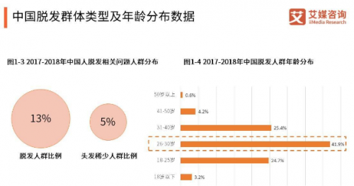 据了解在中国,脱发人群比例占到13%,并越发年轻化。据艾媒咨询数据显示,2017-2018年中国脱发人群主要年龄集中在18-50岁,其中,26-30岁的脱发人群占41.9%。脱发人群规模增加及脱发年轻化为脱发保健行业带来潜在机遇。