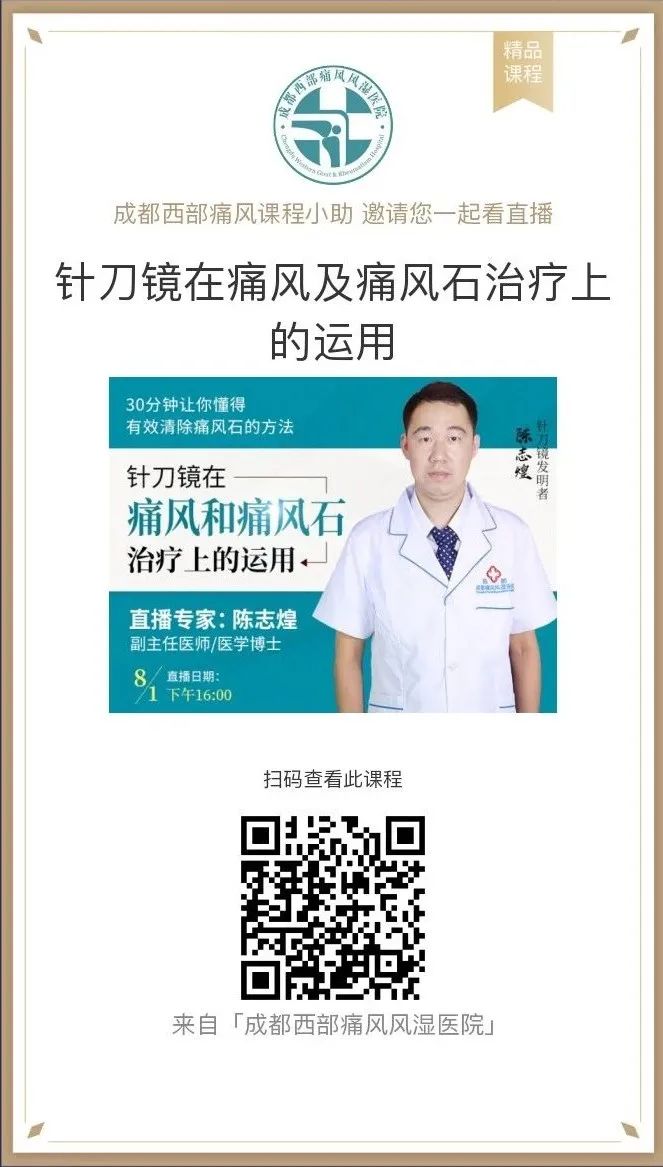 【痛风防治公益会诊】和【痛风专项精准检查】两项需患者网络预约名额(点击左下角“阅读原文”链接),【痛风治疗专家讲座】则无需预约报名,长按下方图片识别二维码进行直播链接即可,讲座将于1日下午16时在线进行,陈志煌教授在线讲解针刀镜技术应用的原理、治疗效果等问题。