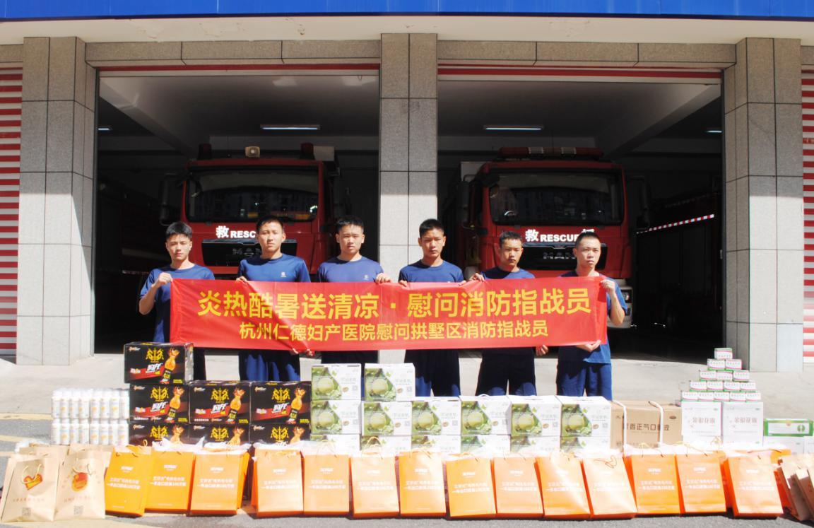 在‘炎炎酷暑,保民平安’,有这么一群人,无论凛例寒冬、炎热酷暑,哪有灾情,哪就有他们的身影,他们跨越火海洪流,用壮怀和无私于危难中挺身而出,践行他们的铮铮誓言,这就是消防战士,和平时代的民族英雄。近期气温高升,容易出现中暑现象,特别是消防指战员们在平时训练中工作强度大,更容易出现这种情况,值此八一建军节之际,为感谢这些长期奋战在救援一线的消防指战员们,杭州仁德妇产医院采购金银花露、霍香正气口服液、饮料、水果等降温消暑物资来到杭州拱墅区消防中队,慰问消防中队全体指战员,并向全体消防官兵们致以亲切地问候和诚挚地祝福,感谢他们为拱墅区的社会和谐稳定作出的贡献。