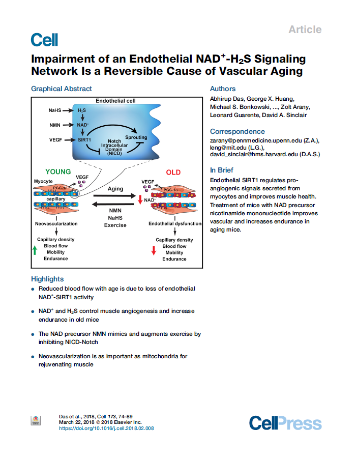 David Sinclair发表在《CELL》科学期刊上关于NAD+能够逆转血管衰老的论文