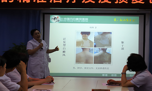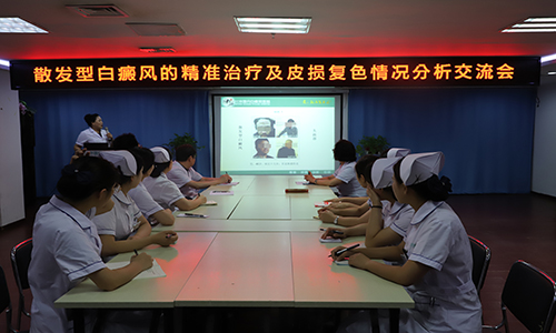 近日,北京国丹白癜风医院白淑芳主任以‘散发型白癜风精准治疗及皮损复色情况分析’为主题开展了交流会,此次大会,北京国丹白癜风医院各科主任、护理人员共同参加。