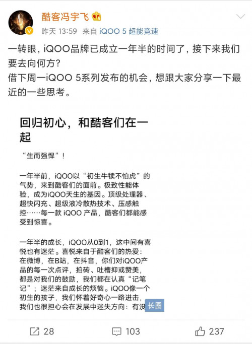 在新旗舰即将发布之际,冯宇飞表示iQOO将重新聚焦目标用户。成立一年多以来,iQOO的市场成绩非常不俗,据此有业内人士推测,在未来发布更多元化的产品后,该品牌将会扩大目标用户群体。而在冯宇飞发布的公开信中可以明显看到,iQOO有重新深度聚焦年轻科技产品爱好者人群的坚定想法,这些用户群体主要生活在一二线城市,与互联网密不可分,十分了解手机的参数和性能,而iQOO手机的强悍性能和“探索之悦”的理念可以很好地与这些用户产生共鸣。