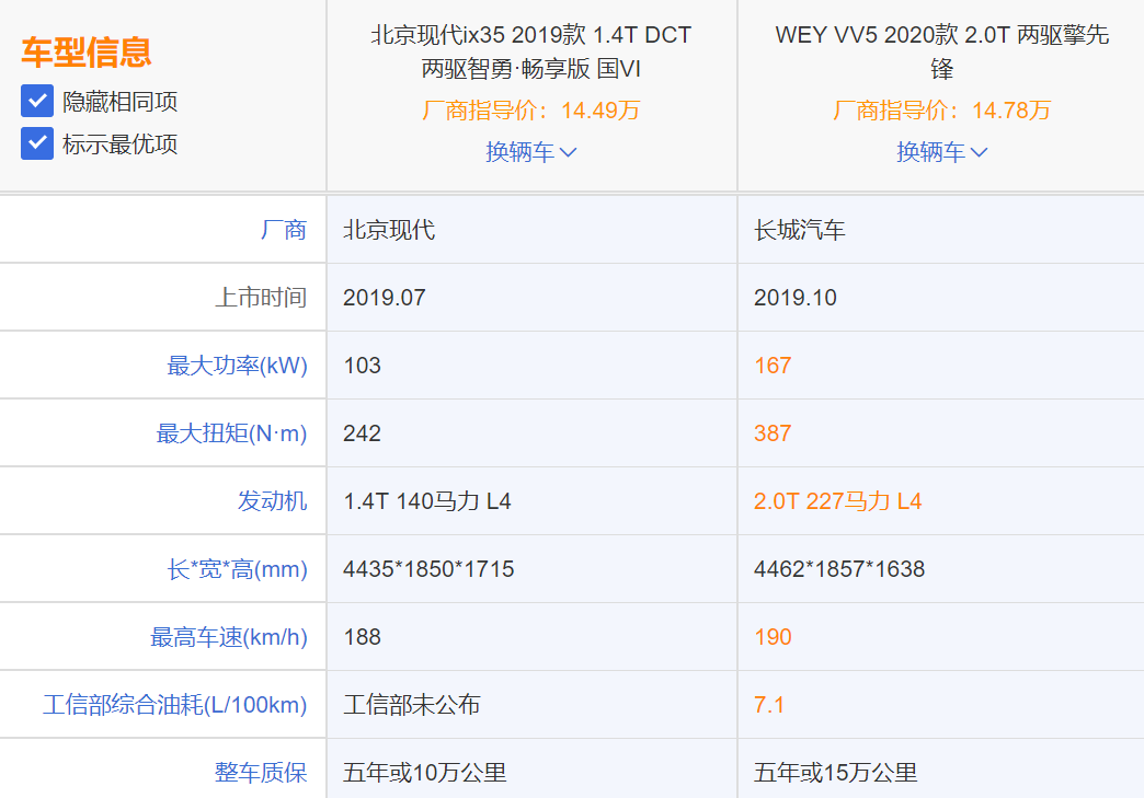 经过对市场的深入调研,与朋友的建议后,我初步锁定了市场中的两位明星选手——现代ix35(2019款 1.4T DCT两驱智勇·畅享版 国VI)、WEY VV5(2020款 2.0T 两驱擎先锋)。但要想找到与我适配度100%的理想型,那还得经过一番对比才能知道答案。