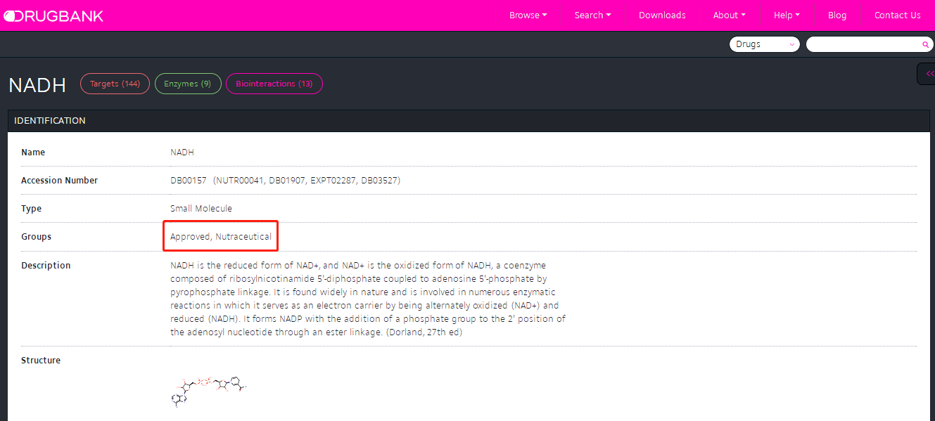 在世界最大、最完整的药物和药物靶标资源库Drug Bank上,NADH被批准为一种营养品,它在欧美国家是常见的膳食补充剂,已畅销20多年。根据FDA Adverse Event Reporting System(FDA不良事件报告系统)和CFSAN Adverse Event Reporting System (CAERS不良事件报告系统)所载数据,从未有过因为口服NADH而引起的不良事件报道。
