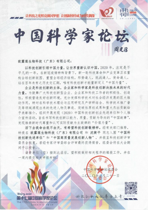 “第十七届中国科学家论坛暨2020创新中国季云博会· 项目科技成果对接洽谈会”将于2020年9月19-20日在北京钓鱼台国宾馆召开。蒜肽综合护肤问的先行者,欧露莲生物科技(广东)有限公司(以下简称:欧露莲)、欧露莲创始人沈衡平受邀出席本届论坛会议,并获提名“2020中国科技创新示范单位”和"中国高质量发展创新人物",品牌的科技创新实力获科技界肯定。