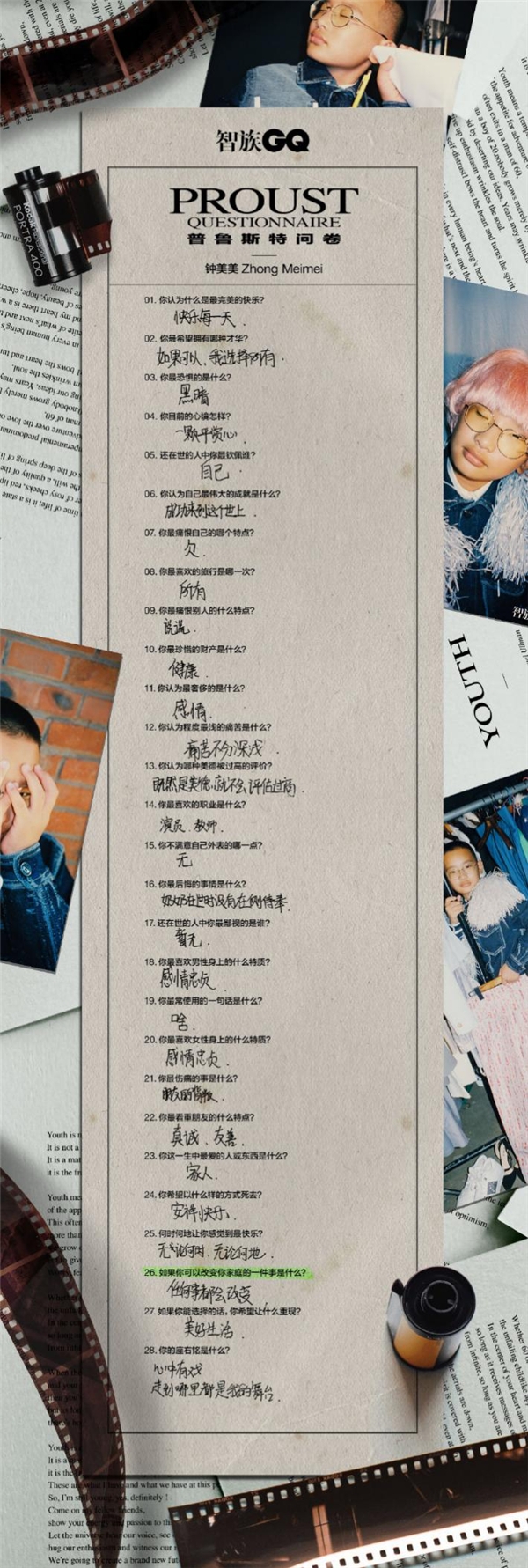 年轻人是怎样一群存在?钟美美的GQ普鲁斯特问卷刷屏了我的华体会(中国)-华体会(中国):“你认为程度最浅的痛苦是什么”,答曰“痛苦不分深浅”;“你的座右铭是什么”,答曰“心中有戏,走到哪里都是我的舞台”……这样的回答吸引了诸多先锋青年的认可,我们一边惊讶于他与年龄不相符的成熟,一边对他不被束缚的思维大加赞赏。毕竟,年轻人的标签就该是个性、独特、自信、打破束缚。