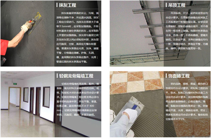 基础杂项:材料搬运、垃圾清理、阴阳角找直、铲墙皮、墙面墙固、地面地固、管道噪音处理。