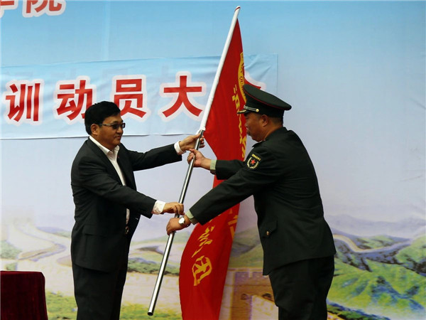 随后,党委书记张清林向2020级新生军训团团长李伟授军训团团旗。