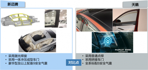 新迈腾达到了欧洲5星碰撞标准,车身高强度高和热成型钢的使用比例高,车顶采用激光焊件,车门采用一体成型技术,安全防护级别高,豪华型以上车型便配备了9个安全气囊。而天籁则是典型的日系车,普通焊接技术,车门是拼接车门,车身安全等级低,同时在安全配置方面也比不上新迈腾。