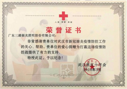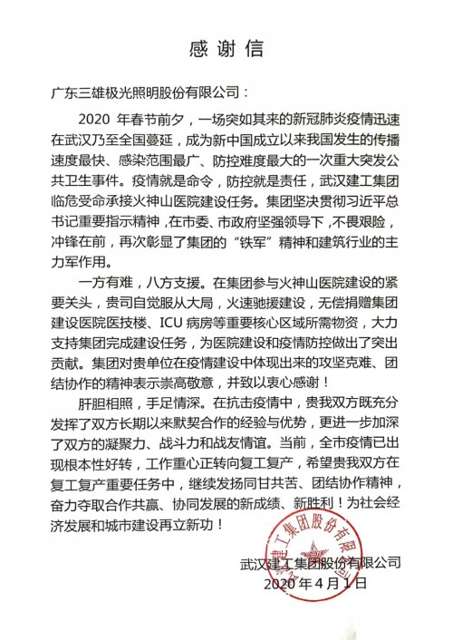 此前,三雄极光已经收到武汉市红十字会的荣誉证书和武汉建工集团的感谢信。未来,三雄极光将继续努力向前,把“光”照进了黑暗,用“光”温暖人心。