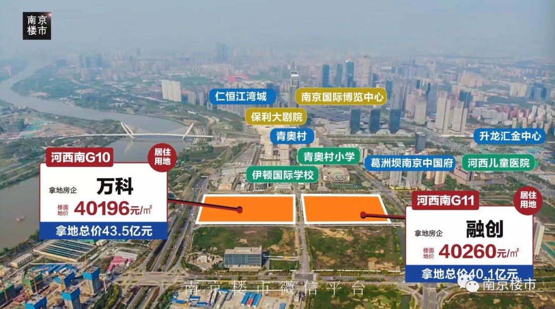 4月底,河西南土拍大战上演,河西南两块宅地分别竞拍到40260元/㎡和40196元/㎡,江宁滨江、板桥也纷纷刷新最高地价纪录。