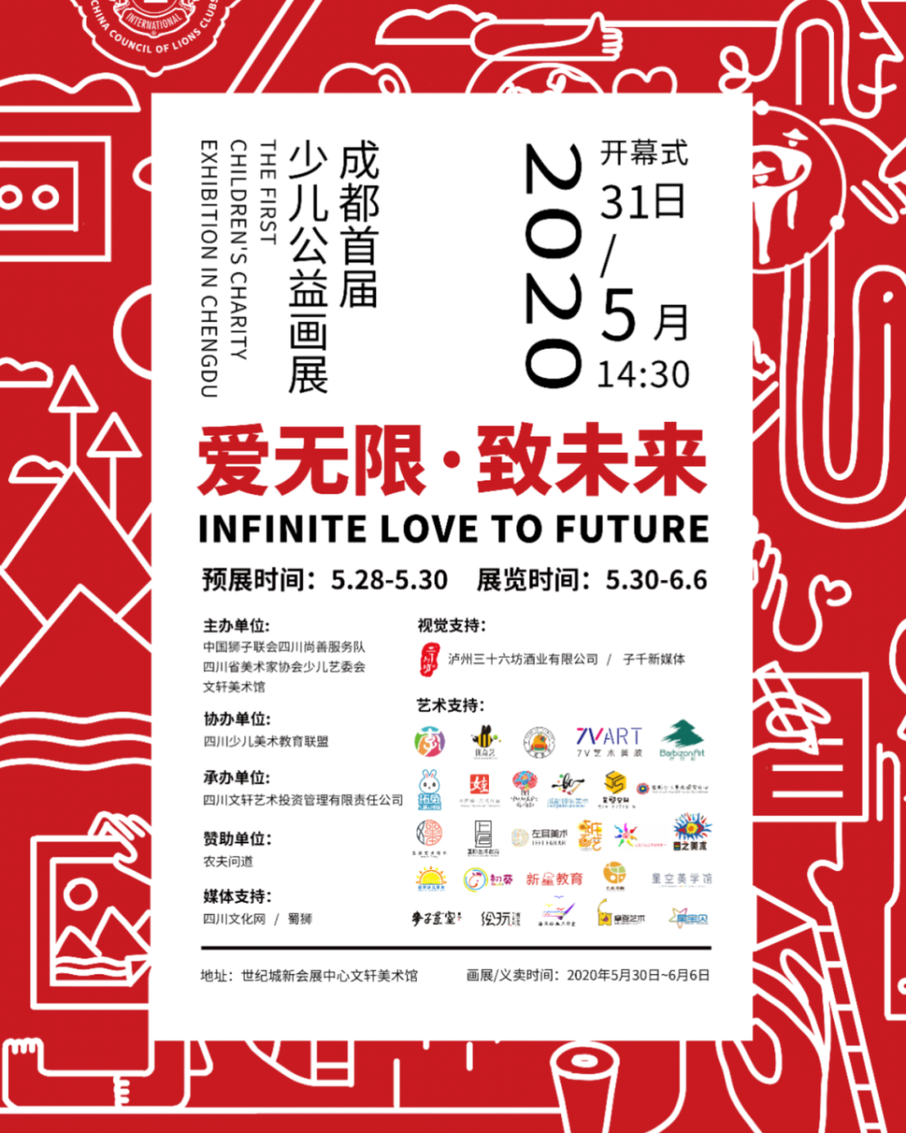 画笔绘童年,快乐共成长。北京时间5月31日下午14:30,由中国狮子联会四川尚善服务队、四川省美术家协会少儿艺委会、文轩美术馆主办;四川少儿美术教育联盟协办;四川文轩艺术投资管理有限责任公司承办;四川农夫问道农业科技独家赞助;四川文化网、蜀狮作媒体报道以及泸州三十六坊酒业有限公司、子千新媒体作视觉支持的主题为“爱无限·致未来”的成都首届少儿公益画展在成都高新区新会展中心时尚天街208-1-1温馨开幕。
