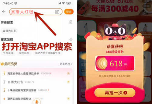 在手机淘宝APP,搜索:“直播大红包”五个字即可领取最高618元红包了哦!记得保存分享给亲朋好友。