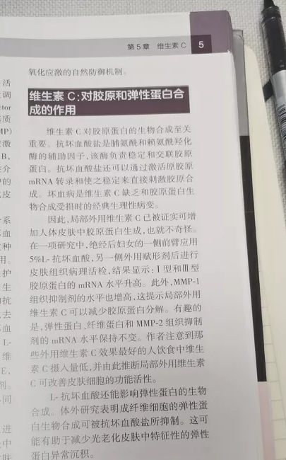 “维生素C对胶原的合成至关重要。抗坏血酸盐(维生素C)是脯氨酰与赖氨酰羟化酶的辅助因子,该酶辅助负责稳定和交联胶原蛋白。抗坏血酸盐还可以通过激活胶原mRNA转录和使之稳定来直接刺激胶原合成。坏血病是维生素C缺乏和胶原蛋白生物合成受损时的经典生理性病变。因此局部外用维生素C已被证实可增加人体皮肤中胶原蛋白的合成,也就不奇怪。热玛吉术后即刻,使用适量浓度的维生素C涂抹,有促进胶原蛋白合成的功效。