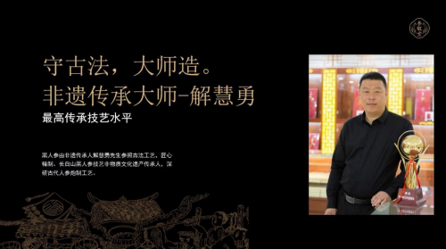 参敬堂黑人参所采用的黑参产品,都是由非遗传承人解慧勇先生参照古法工艺精制而成。解慧勇先生乃是长白山黑人参技艺非物质文化遗产传承人,深研古代人参炮制工艺。所研制的每一支黑参产品,都严格执行了“九蒸九晒”制作流程。九蒸九晒是一种采用蒸法和晒法反复炮制中药材的方法。讲究的是夜间蒸制,吸收纯阴之气,白天晾晒,吸收纯阳之气。晾晒干燥后再进行二次蒸制,逢三次蒸晒后必需将人参置入汤中浸泡一个时辰,如此反复,每个程序经过9遍,要经历81个昼夜,将近2000多个小时,才能炮制出合格的黑人参。