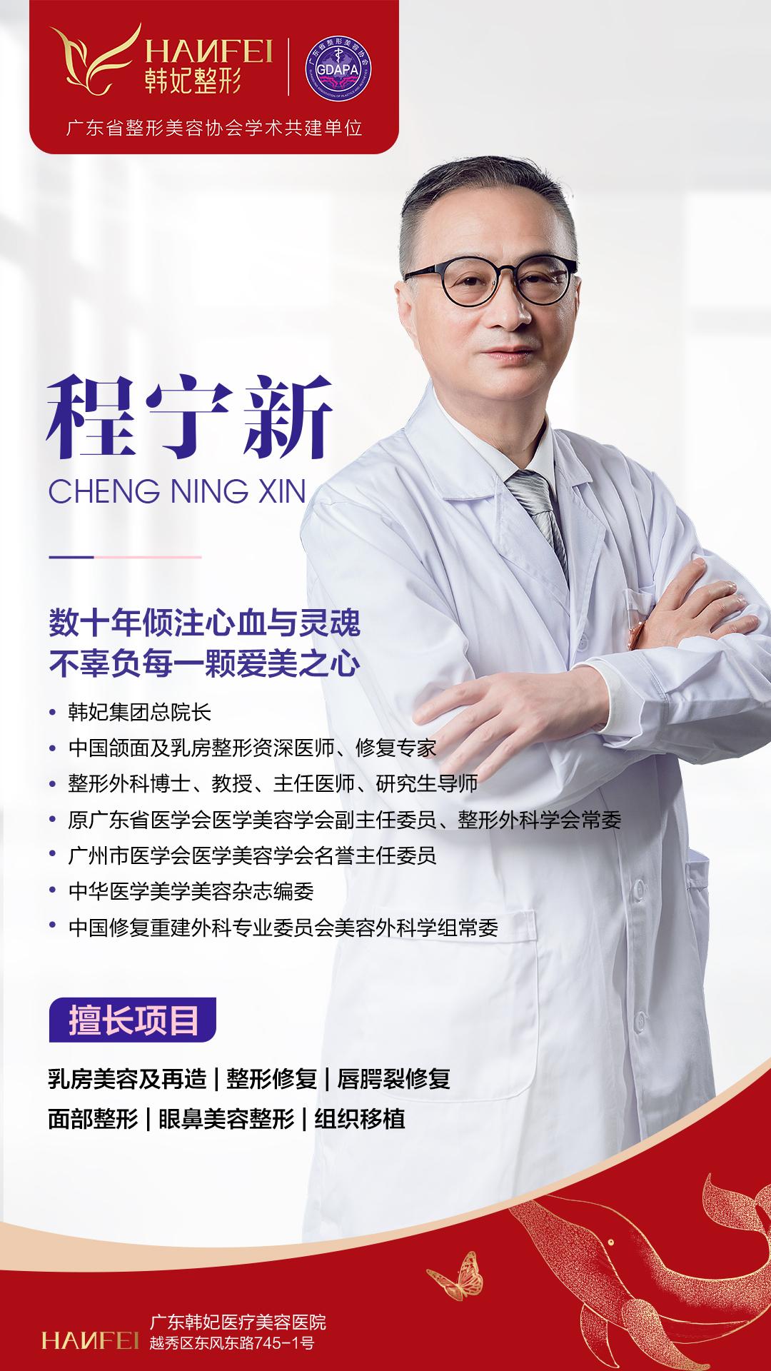 程宁新教授是我国培养的整形外科博士,师从于我国整形外科创始人之一宋儒耀教授,作为中国整形外科先驱专家,程宁新教授拥有40余年整形美容临床医教研工作经验,已成功救助数十万整形失败修复案例。自70年代起从事整形外科临床工作至今,专注整形美容学术研究,共获得省、市、局级科技成果奖,在国内、外广受业界追捧,被誉为“整形界的活教科书”。