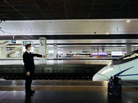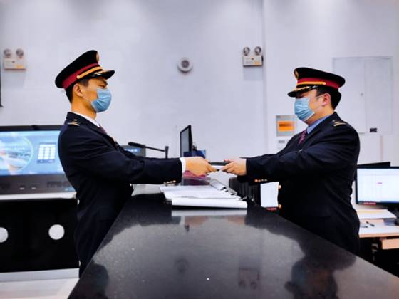 一个铁路工作人员交接工作的瞬间