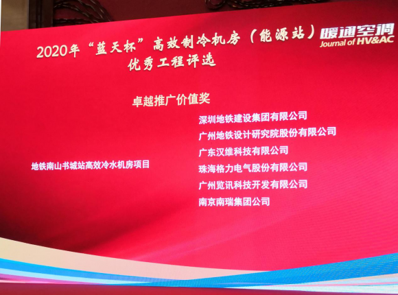 其中,广州览讯科技开发有限公司设计开发的高效机房专用冷却塔设备应用于深圳地铁集团南山书城站高效冷水机房项目助其大幅提升制冷机房节能水平,使得地铁站制冷系统综合节能40%以上,也因此斩获了卓越推广价值奖、卓越节能设计奖、卓越节能技术奖及卓越节能产品奖,该项目也成为本次蓝天杯参选的50多个项目中唯一一个揽获四项大奖的项目。