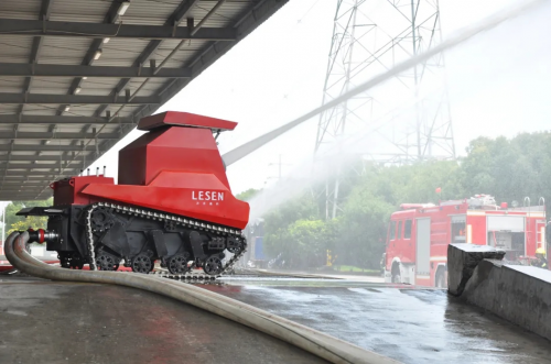 本次演练所用机器人是力升高科首创的1000℃耐高温消防机器人。在高温炙烤、浓烟弥漫……人不能近、人不能及的火情危机时刻!1000℃耐高温消防机器人一马当先,替代消防员进入火灾危险线区域进行灭火。在消防员的操作下,消防机器人精准地喷出水柱划出一道弧线,洒向着火的厂房。同时与消防人员密切配合,不久就将火扑灭了。