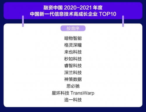 作为新一代的边缘计算公司,秒如科技以专业的核心技术、优秀的研发团队和长远的未来发展赢得了融资中国评选团队的认可,荣膺“2020-2021年度中国新一代信息技术高成长企业TOP10”的奖项。