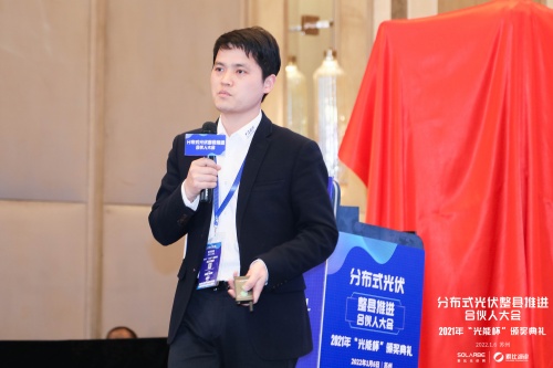 1月6日, 2021年度“光能杯”跨年分享会/分布式整县推进合伙人大会暨颁奖盛典在苏州盛大开幕,知名光伏企业代表齐聚盛会,共同回顾2021光伏产业斐然成绩,展望2022全新发展机遇。高功率组件技术领跑企业东方日升出席活动,中国区销售技术负责人邓斌以《东方日升210超高功率组件助力分布式发展》为主题发表演讲,探索“整县推进”下,210产品在分布式场景高价值应用方案。