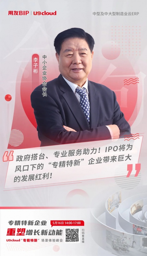 在此次线上峰会中,中国中小企业协会会长李子彬在致辞中谈到:“专精特新企业急需中小企业协会+北交所+用友等公司服务商给予专业指导,包括上市政策解读、企业合规建设、企业数智化转型、IPO专版方案等。”