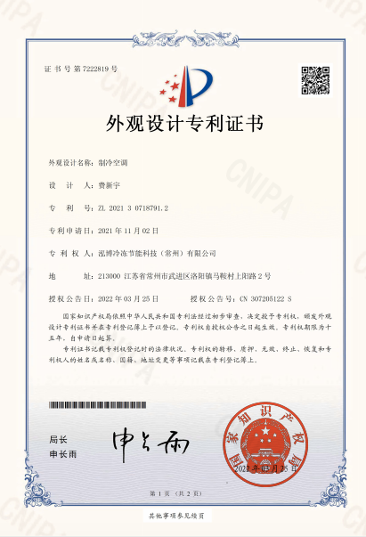值得一提的是,泓博科技拥有经验丰富的研发团队、专业的工程方案设计团队,其研发设计的制冷空调,荣获国家外观设计专利证书。