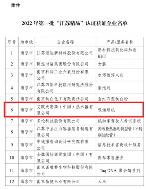 江苏精品”是江苏省委、省政府大力实施品牌发展战略、建设质量强省的一项重要举措。获得“江苏精品”认定的产品为具有国际先进(国内领先)水平,创新能力强、品质卓越、 品牌效应好、经济和社会效益显著的自主品牌产品。由江苏省委、省政府牵头组织依据国际通行认证标准和流程严格评选,是高品质、高水平的代名词,含金量极高。A. O.史密斯「瀞」油烟机荣获“江苏精品”认证既是对产品质量的肯定,也是对A.O.史密斯创新与研发实力的认可。
