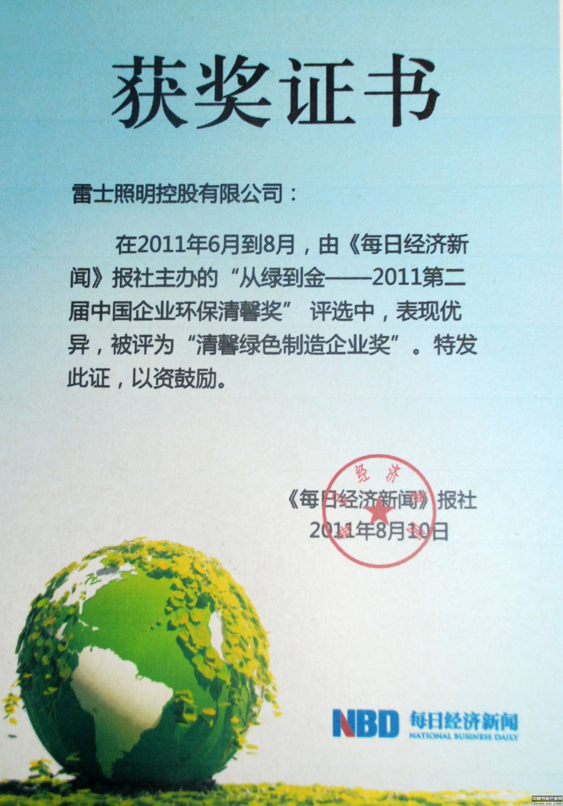 上海2011年8月16日电 /美通社亚洲/ -- 8月10日下午,“从绿到金”2011年世界环境日特别活动在北京举行,此次会议产生了第二届中国企业环保清馨奖。雷士照明、三一重工、宗申动力等16家优秀企业斩获2011年中国企业环保清馨奖。