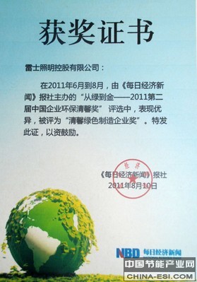 当前,能源和环境危机是全世界共同面对的课题,而照明节能是非常重要的部分,据统计,照明消耗中国总发电量达到13%。发展绿色照明、低碳经济成为政府和社会共同努力的发展方向。雷士照明此次荣获中国企业环保清馨奖,这是主办方对雷士照明在发展绿色照明、推广节能环保产业所贡献的肯定。