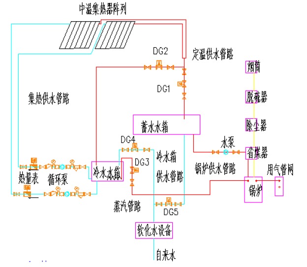 自来水经过软化处理后进入冷水箱,通过循环泵进入中温集热器,太阳照射到中温集热器上,由中温真空管将太阳辐射转化为热能,再由真空管内的铜管把热能传递给冷水,将水加热,热水通过循环泵输送到储热水箱,再经过蒸汽锅炉加热成高温蒸汽输送到厂区热力管网。