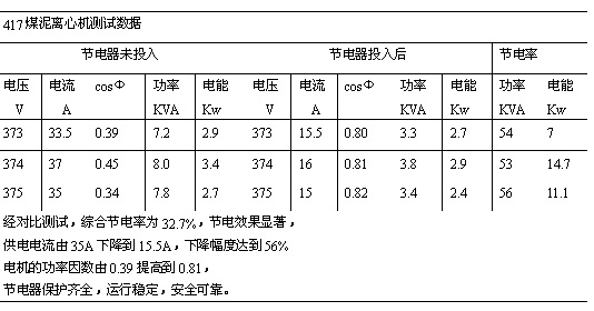 为了更科学的测试节电效果,对两台设备都加装了电能表,经过一个月的计量测试,417煤泥离心机用电8022度,418煤泥离心机用电16778度,在两设备同时开停,运行时间相同,设备功率相同的情况下,417比418节电52.2% 阳煤二矿主要设备电机有16台,共1112KW,按电价0.27,运行时间20小时/天计算,年总用电费219万元,按节电率30%计算,年节电65.7万元,设备投资67万元,一年就收回设备投资,经济效益十分显著。按节电器十年的使用寿命计算,共节电657万元,收益率为980%,