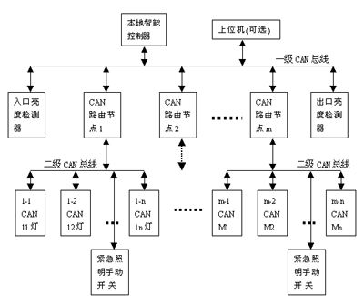在上述方案图示中,我们采用了二级网络结构,第一级CAN总路线上挂接着本地和远程智能控制器、洞口和洞内的亮度检测器、以及m个二级CAN总线路由器等组成。每个二级CAN总线上挂接着n个灯具开关或调光CAN控制器与数个照明紧急手动开关组成。其中m个CAN路由节点主要是完成一级总线与二级总线之间的双向数据传输;本地照明智能控制器完成隧道照明自动控制与远程监控功能;挂在第二级CAN节点上的照明紧急手动开关提供司机紧急照明局部开灯要求,及报警信号反馈等作用;CAN开关或调光控制器实现接收本地控制器的命令,进行译码控制每盏灯具的开启、关闭及调光。图中上位机指设在隧道管理房的控制计算机。