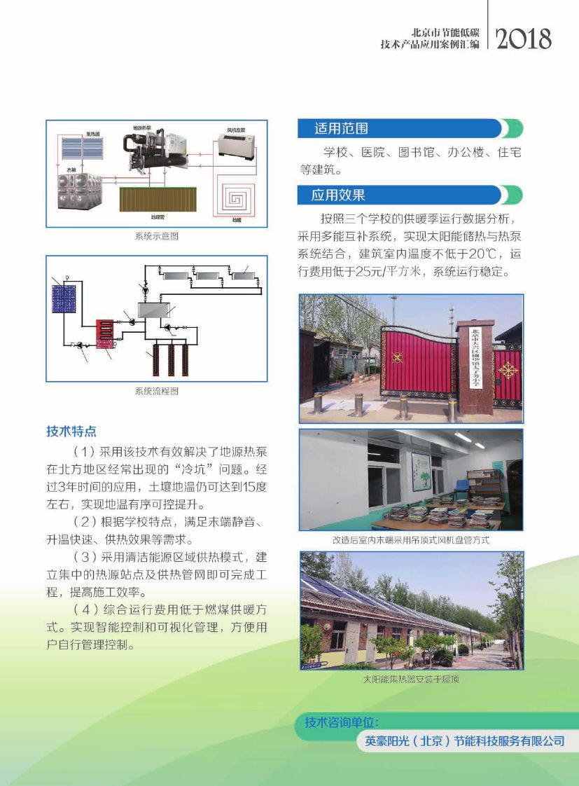 该技术主要包括太阳能集热系统、热泵系统、室外地源换热系统和室内末端系统,通过优化控制,将太阳能光热技术、浅层地源热泵技术和土壤储热技术有效结合,充分利用可再生能源,为建筑物供暖和制冷。